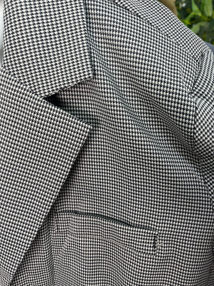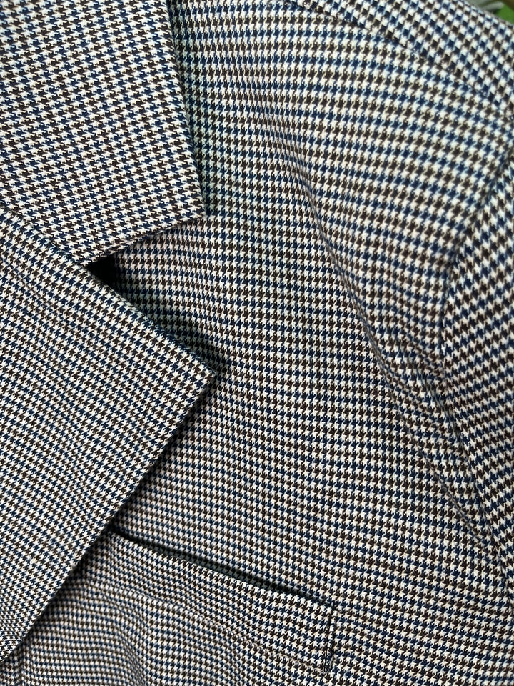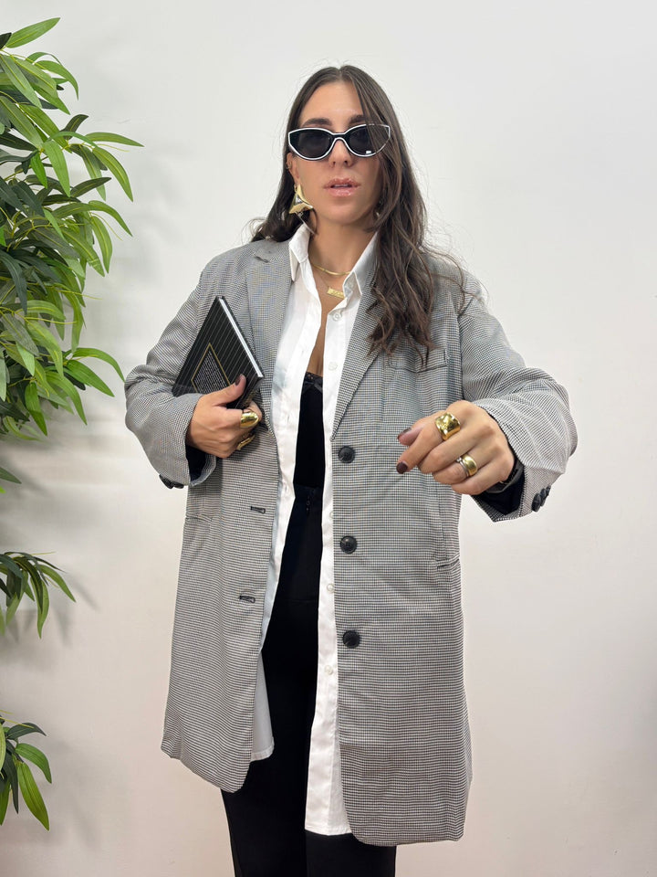 Blazer elegante e versatile, caratterizzato da fantasia pied de poule che dona un tocco sofisticato al look. Realizzato con tessuto strutturato e fodera interna, è perfetto da indossare sia con jeans per un outfit casual chic, sia con pantaloni classici per un look più formale.