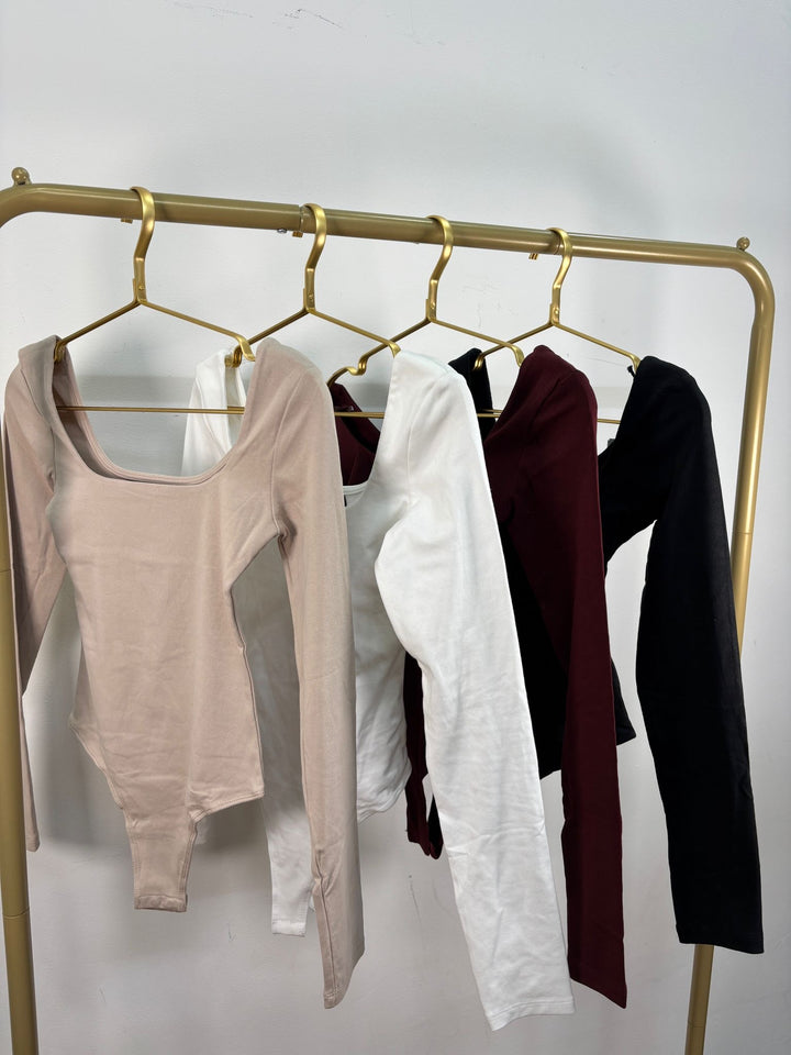 Body a maniche lunghe in cotone elasticizzato con scollo quadrato che valorizza il décolleté e dona un tocco raffinato ad ogni look. Perfetto da indossare sotto blazer, cardigan o con pantaloni a vita alta per un outfit sempre impeccabile.