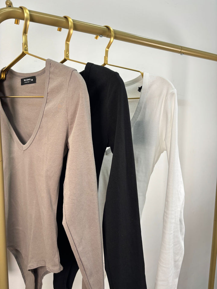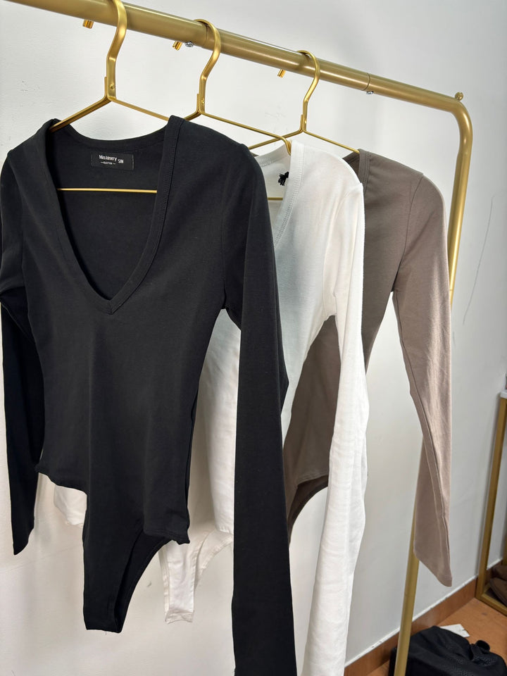 Body a manica lunga in morbido cotone, scollo profondo a V e vestibilità aderente che valorizza la silhouette. Perfetto da indossare con jeans, gonne o pantaloni sportivi per un look casual ma curato.