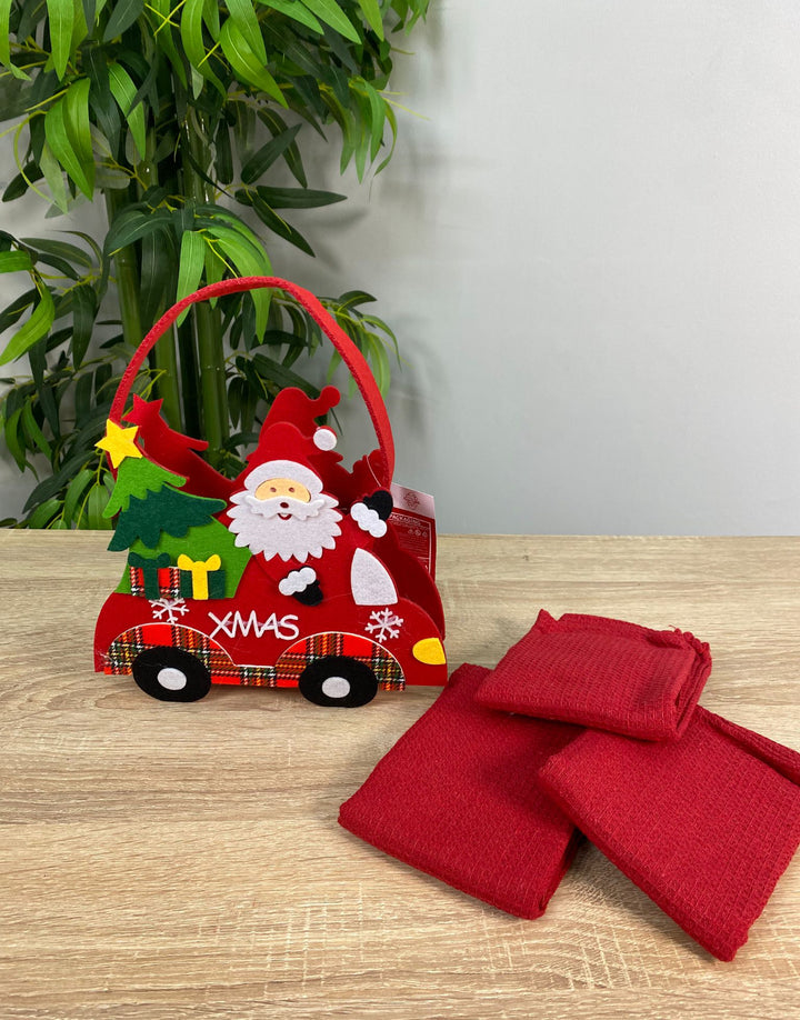 Porta la magia del Natale nella tua cucina con questo delizioso set composto da un cestino a forma di albero natalizio e 3 strofinacci rossi coordinati.