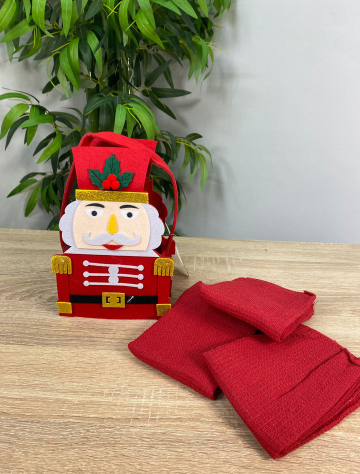 Porta la magia del Natale nella tua cucina con questo delizioso set composto da un cestino a forma di albero natalizio e 3 strofinacci rossi coordinati.