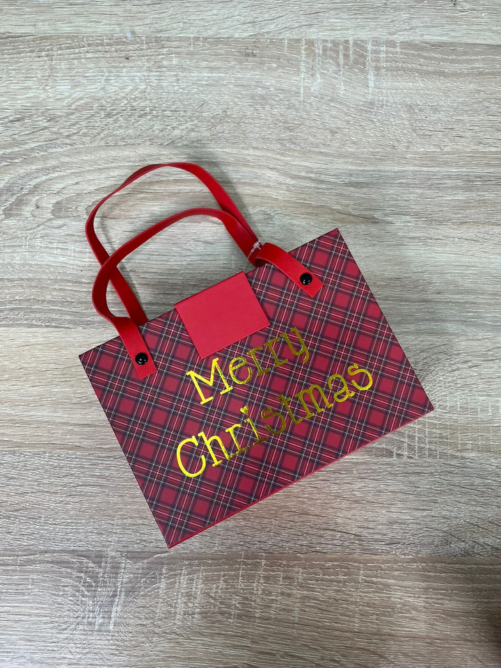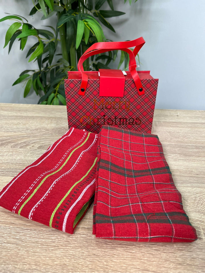 Porta la magia del Natale anche in cucina con questo elegante set di strofinacci natalizi, presentato in una raffinata bustina regalo scozzese con manici rossi.