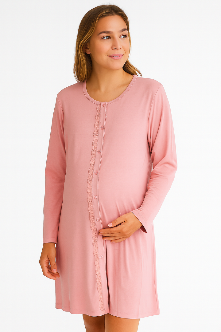 Comoda e femminile, questa camicia da notte è perfetta per future mamme che cercano praticità e dolcezza. Realizzata in morbido cotone leggero, ha apertura frontale con bottoni e un delicato inserto in pizzo che le dona un tocco elegante. Ideale sia per la gravidanza che per l’allattamento.