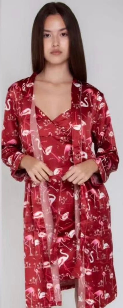Rendi le tue serate e le tue mattine più chic con questo elegante pigiama in raso, caratterizzato da un design luminoso e setoso che avvolge con delicatezza la pelle. Il motivo a fenicotteri dona un tocco glamour e divertente, perfetto per chi ama distinguersi anche nei momenti di relax.