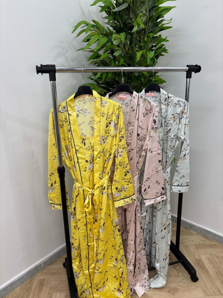 Elegante e raffinato, questo pigiama lungo in raso regala comodità e stile in ogni momento della giornata. Il tessuto leggero e setoso scivola sulla pelle con delicatezza, mentre la fantasia floreale dona un tocco romantico e femminile. Completo di cintura in vita, è perfetto sia come pigiama che come homewear chic.