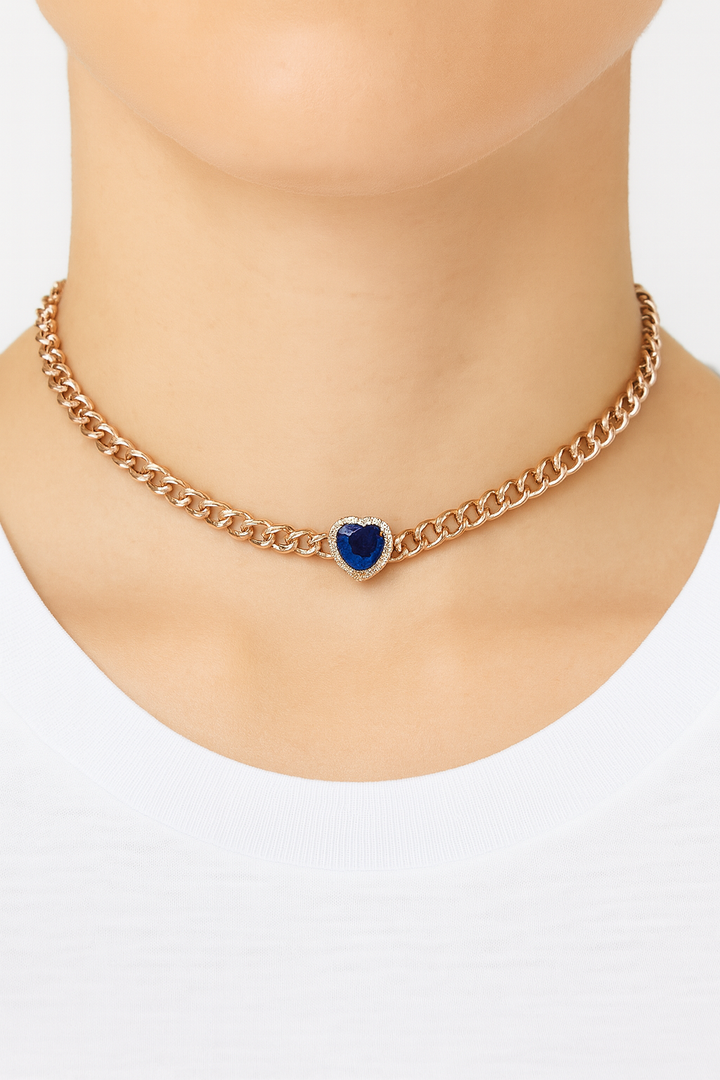 Un choker elegante e di carattere, impreziosito da un pendente a cuore con cristallo blu intenso contornato da zirconi luminosi. Perfetto per aggiungere un tocco raffinato e moderno ai tuoi look.