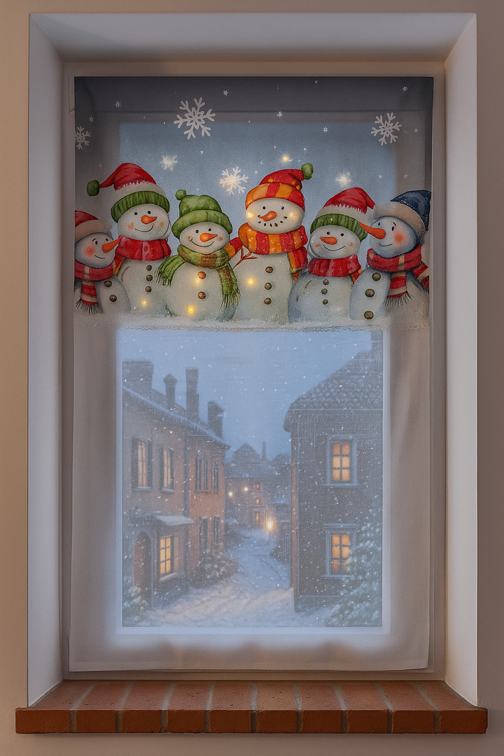 Tendine natalizie con stampa pupazzo di neve e dettagli glitterati, perfette per decorare la casa durante le feste. Realizzate in tessuto resistente, arricchite da luci LED integrate per un effetto luminoso e accogliente.