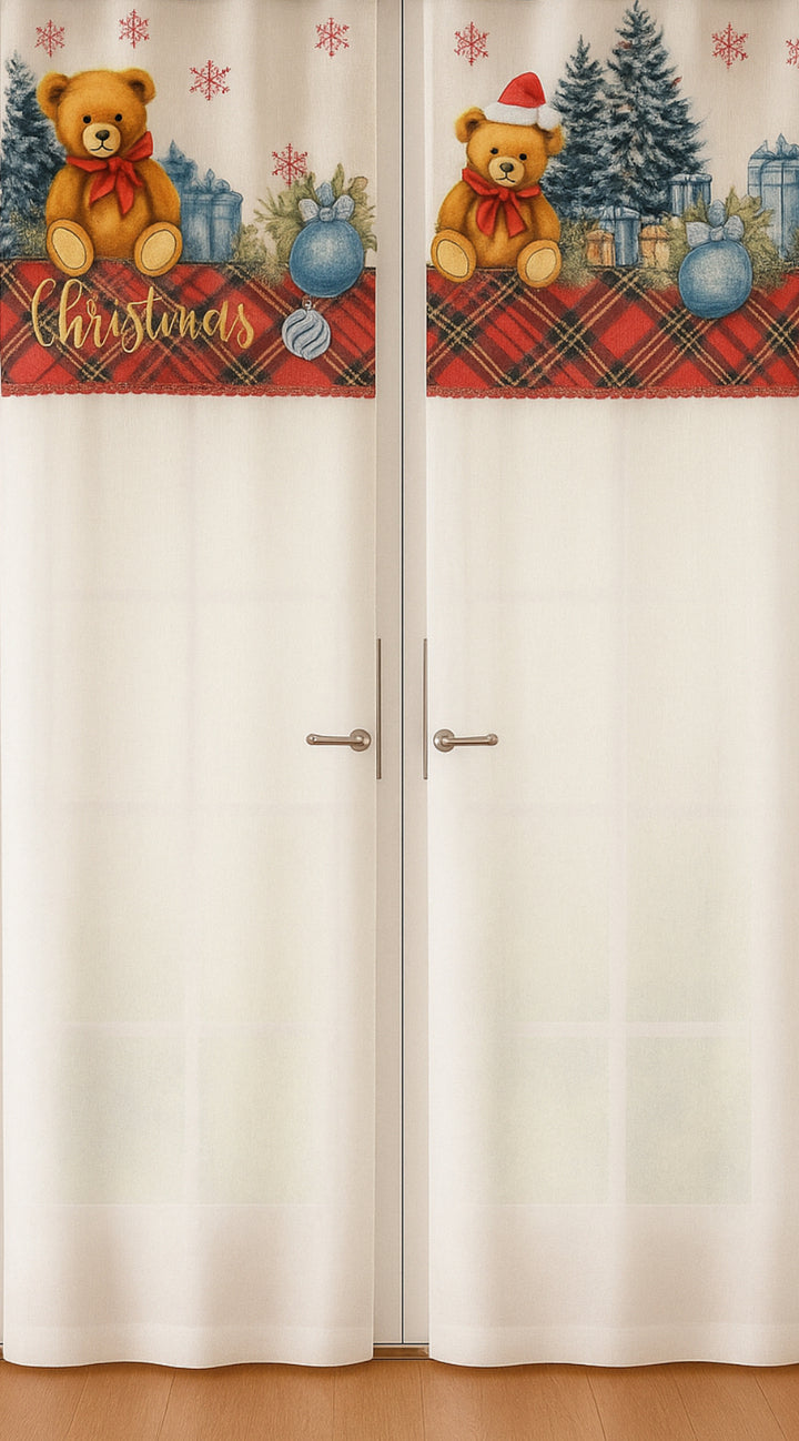 Tendine natalizie con stampa teddy e dettagli glitterati, perfette per decorare la casa durante le feste. Realizzate in tessuto resistente, arricchite da luci LED integrate per un effetto luminoso e accogliente.