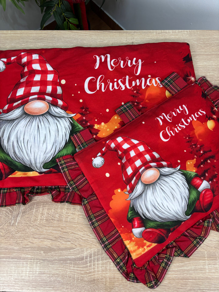 Set in tessuto con stampa Gnomo e decori Christmas, rifinito da balza scozzese rossa.