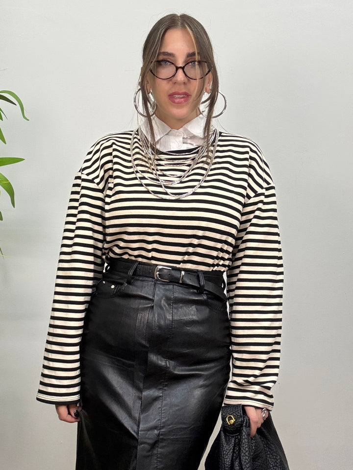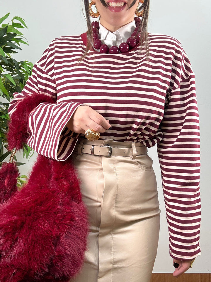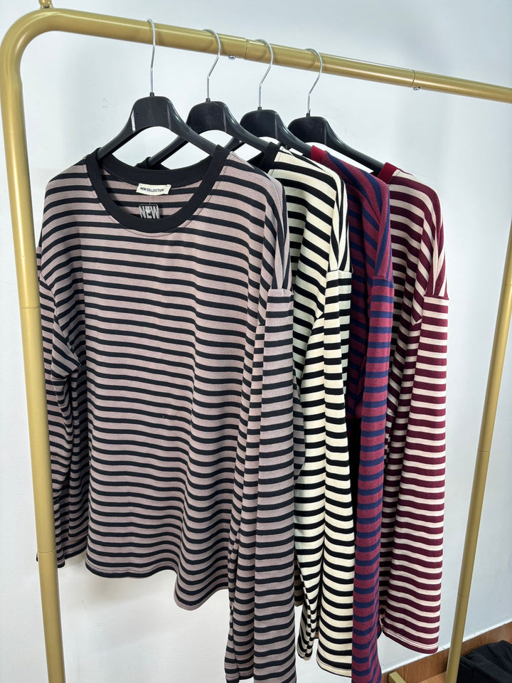 Felpa a righe orizzontali con taglio morbido e maniche leggermente ampie. Realizzata in tessuto leggero e confortevole, perfetta da indossare sopra camicie o da sola per un look effortless ma curato.