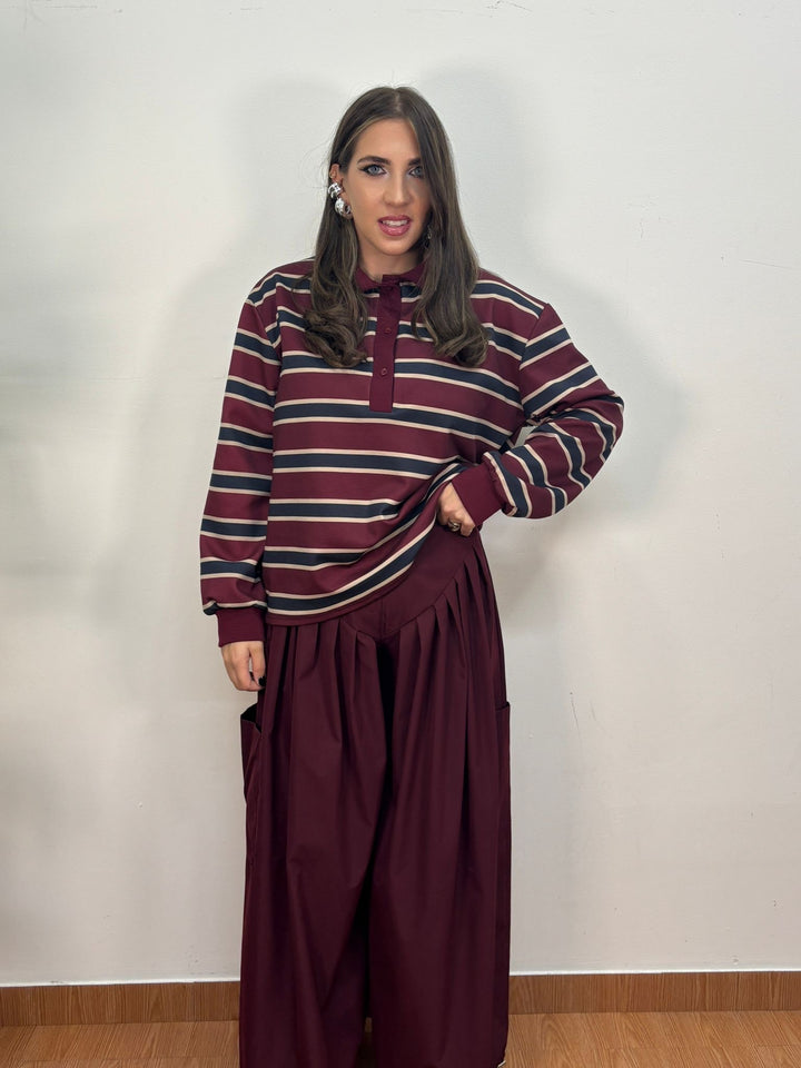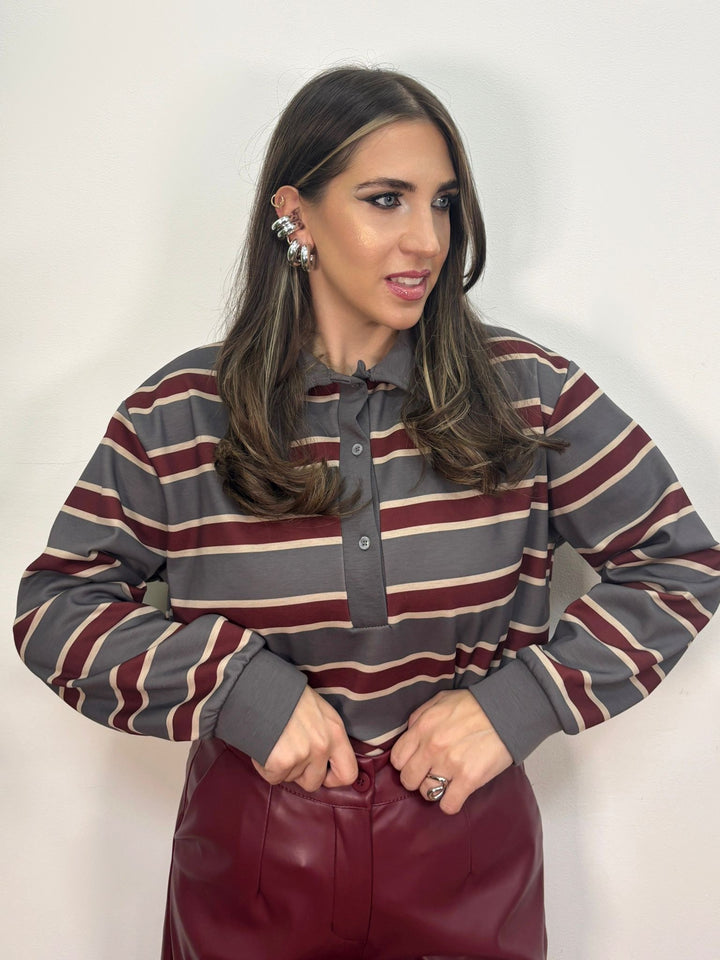 Felpa con colletto a polo e chiusura a bottoncini, impreziosita da fantasia a righe dal gusto retrò. Realizzata in tessuto morbido e confortevole, è ideale per look casual ma sempre curati.
