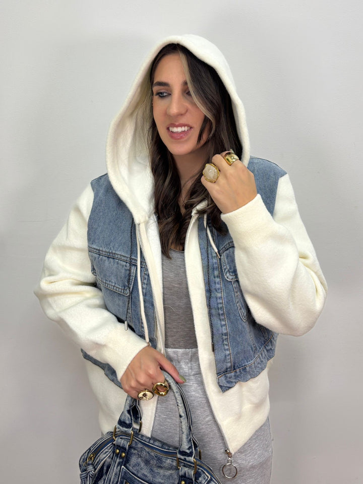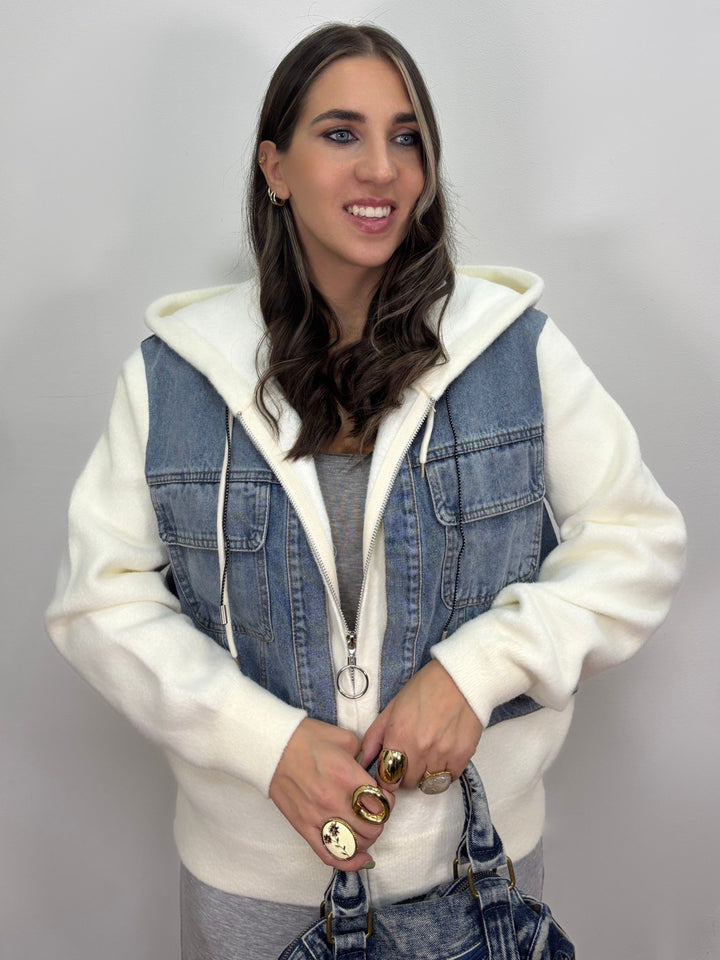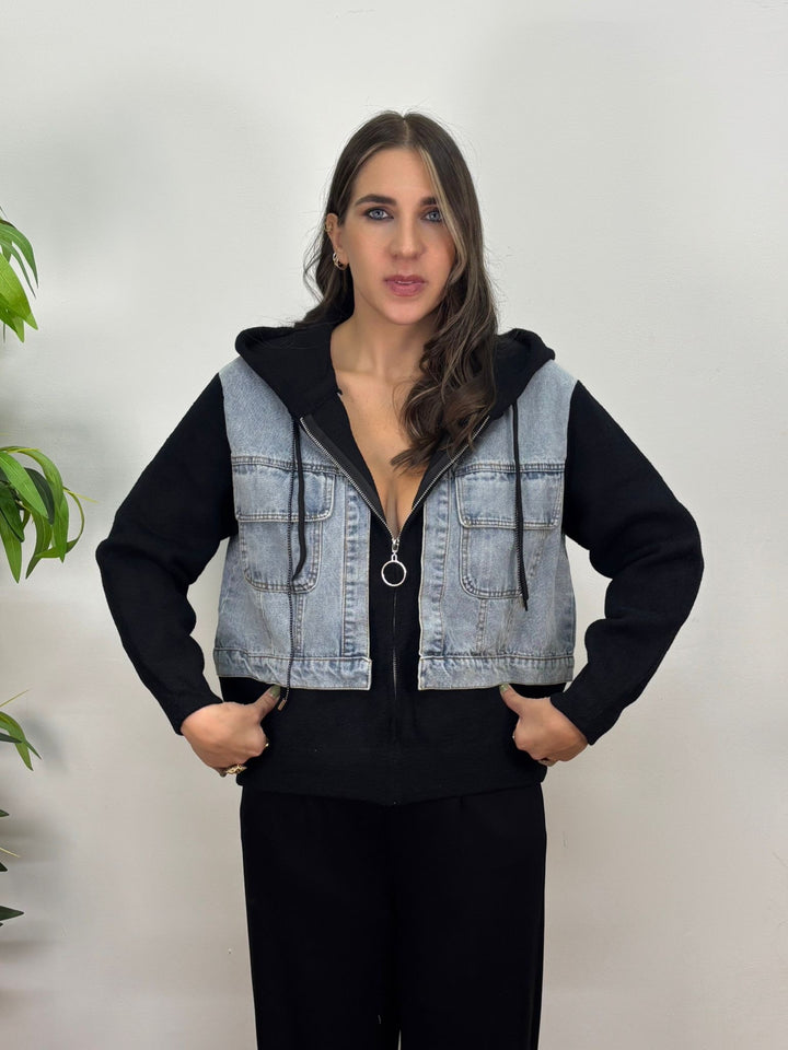 Giubbino in stile casual-chic con mix di tessuti: parte superiore in denim panna effetto vintage e maniche in morbido cotone nero.
