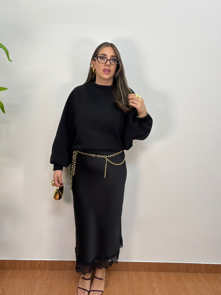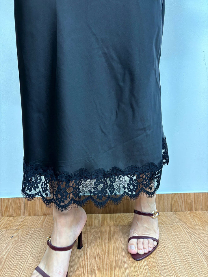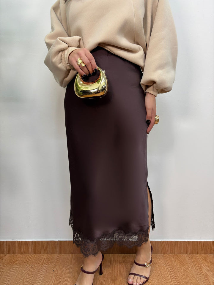 Gonna midi in raso lucente con delicato bordo in pizzo macramè sul fondo. Linea dritta che valorizza la silhouette, perfetta da abbinare a maglioni morbidi o body per un look chic e sofisticato.