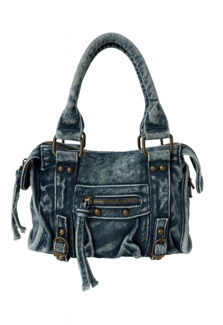 - Realizzata in tessuto effetto denim con dettagli in metallo