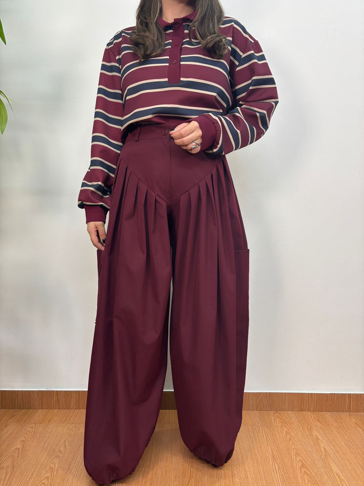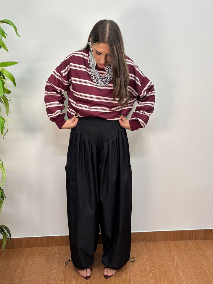 Pantalone modello balloon a gamba ampia con dettagli arricciati e tasche laterali. Realizzato in tessuto morbido e fluido, dona un effetto moderno e raffinato mantenendo una vestibilità confortevole.
