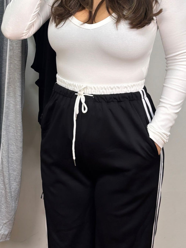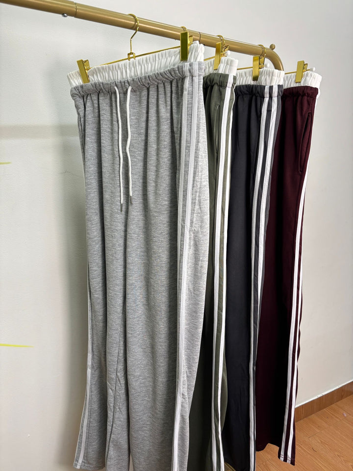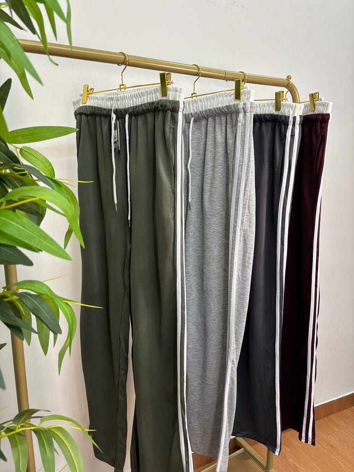 Pantalone tuta con coulisse in vita, linea morbida e dettaglio laterale a righe che slancia la figura. Realizzato in tessuto leggero e confortevole, perfetto per look sportivi ma curati.