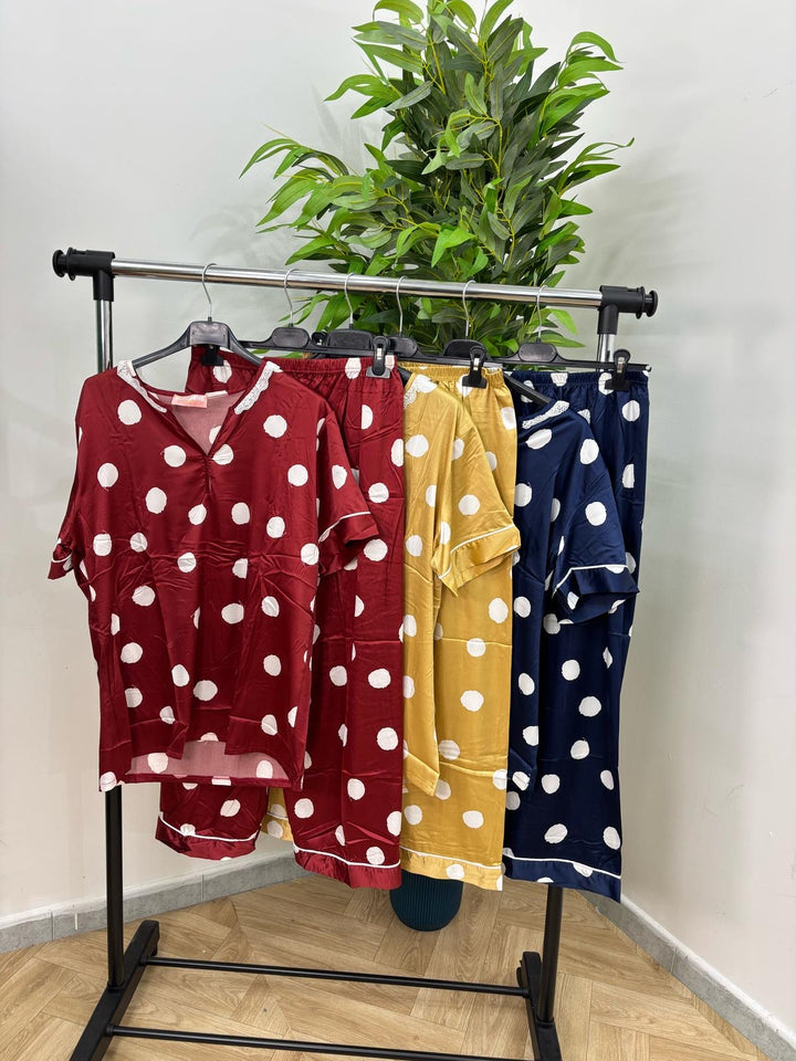 Un completo pratico e alla moda che unisce comfort e stile. Realizzato in raso leggero e luminoso, questo pigiama dona freschezza e morbidezza sulla pelle. Il motivo a pois, intramontabile e chic, rende il look divertente ma elegante, perfetto sia per la notte che come comodo homewear.
