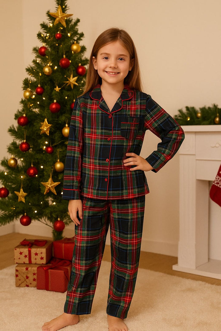 Questo pigiama bimba in tessuto scozzese blu e rosso è perfetto per rendere speciali le serate invernali. Il completo è composto da camicia a maniche lunghe con bottoni frontali e taschino e pantalone lungo coordinato con elastico in vita, per garantire comfort e libertà di movimento.