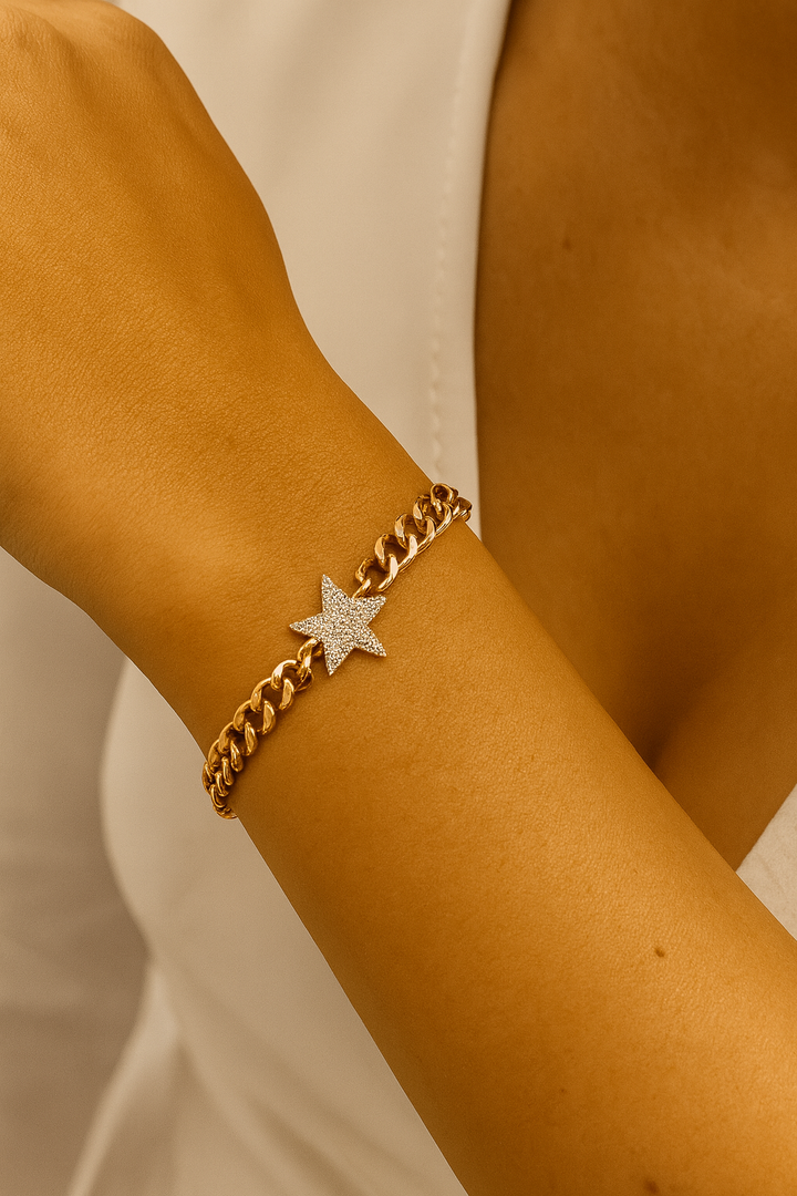 Un accessorio elegante e moderno, perfetto per dare un tocco di luce e personalità al polso. La catena a maglia valorizza il design, mentre la stella centrale tempestata di zirconi rende il bracciale raffinato e versatile.