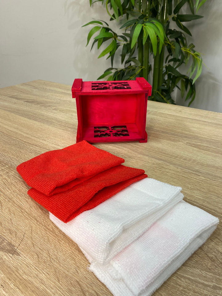 - Include 4 strofinacci in morbido tessuto assorbente (2 rossi + 2 bianchi)