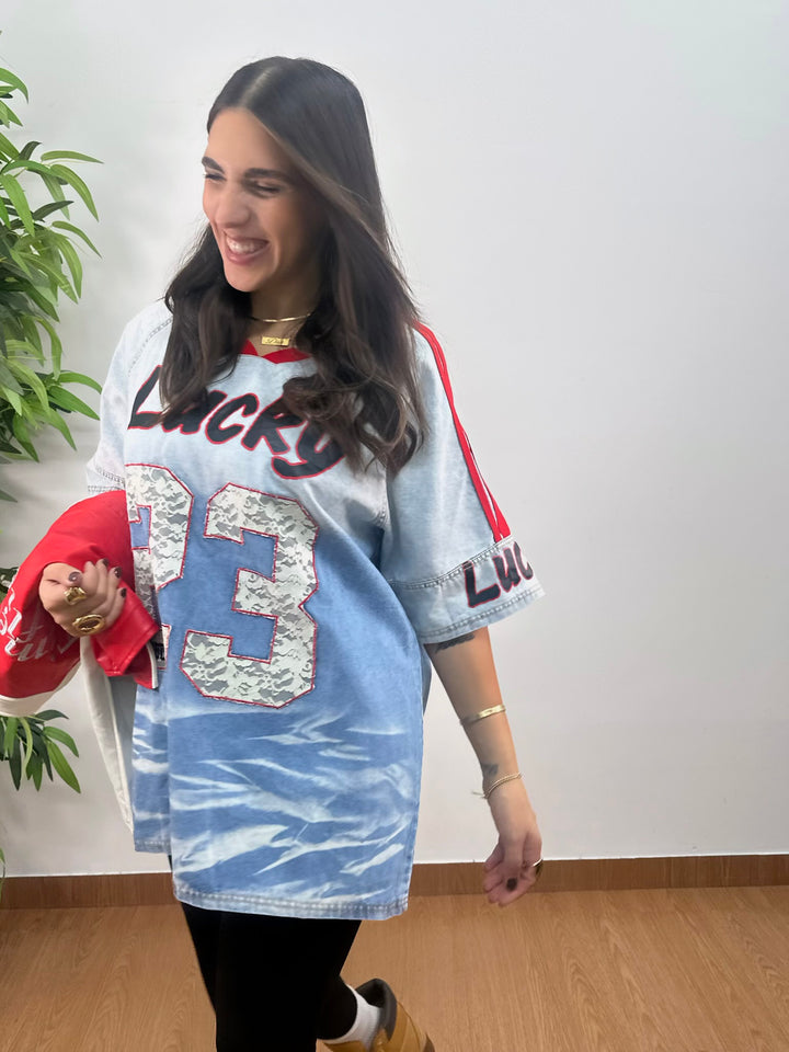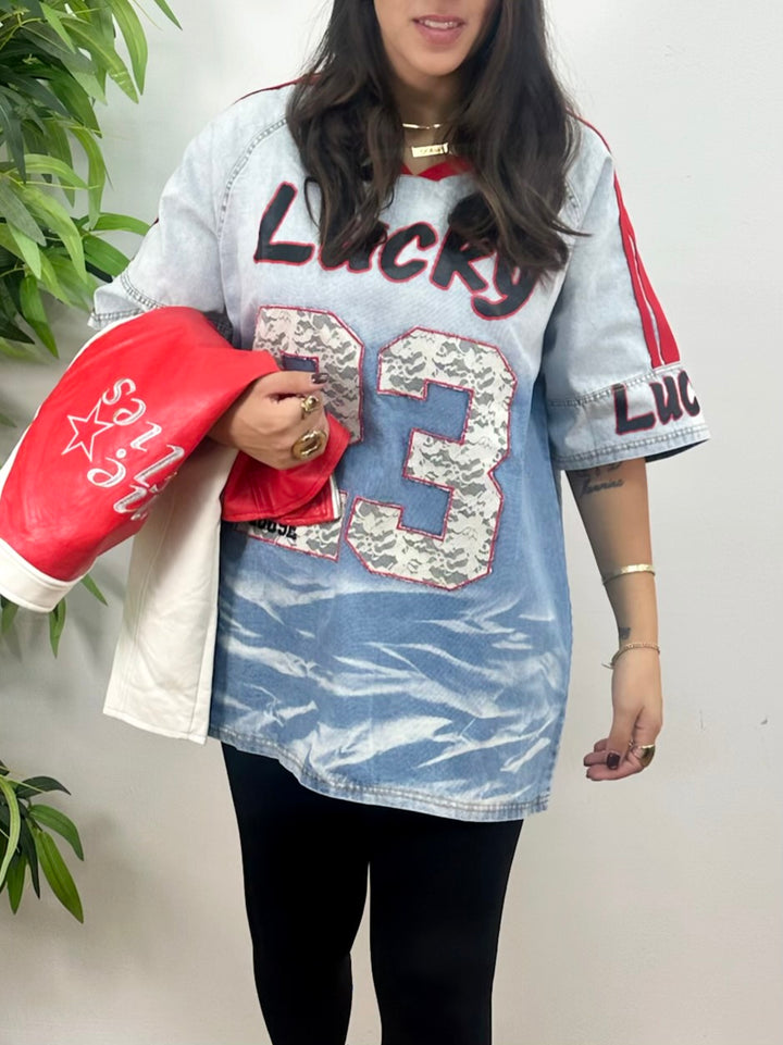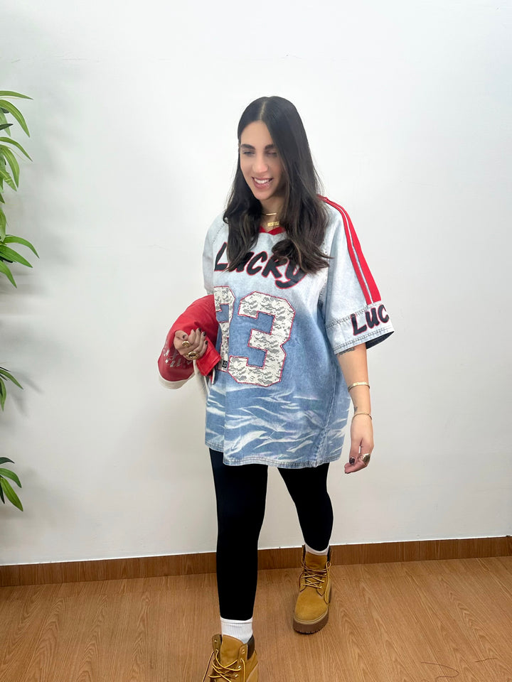 Stile casual e grintoso: questa maglia oversize in tessuto effetto denim presenta dettagli sportivi con scollo e maniche rifiniti in contrasto rosso. Sul davanti, maxi stampa numerica “23” arricchita da inserto in pizzo bianco, per un mix originale tra sporty e femminile. Perfetta da portare con leggings, shorts o jeans per un look urban di tendenza.