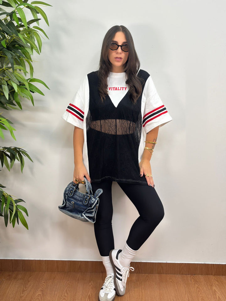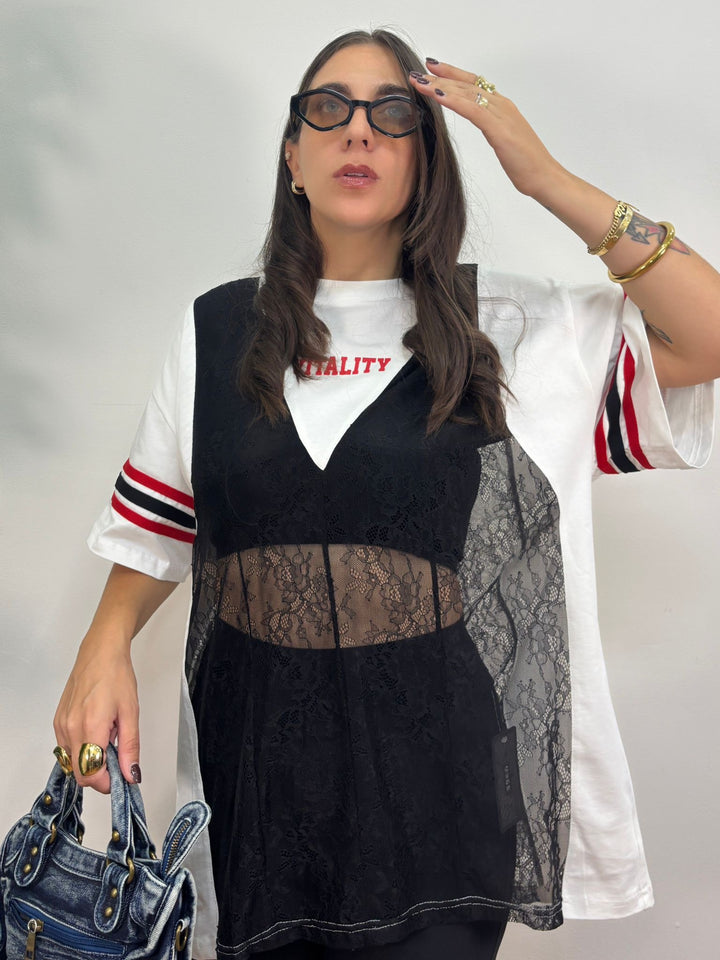 Una t-shirt che unisce lo stile sportivo al fascino del pizzo. Realizzata in cotone bianco con stampa frontale “VITALITY”, è arricchita da inserti in pizzo nero trasparente sul davanti e sulle spalle, per un look fresco e originale. Le maniche con bande rosse e nere completano il design dal carattere giovane e trendy.