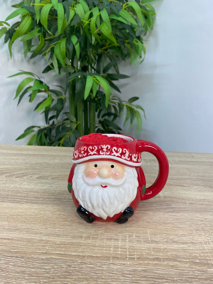 La tazza, in ceramica smaltata, riproduce il dolce volto di Babbo Natale con dettagli curati: il berretto rosso decorato con motivi bianchi, le guance rosate e la sua immancabile barba bianca.