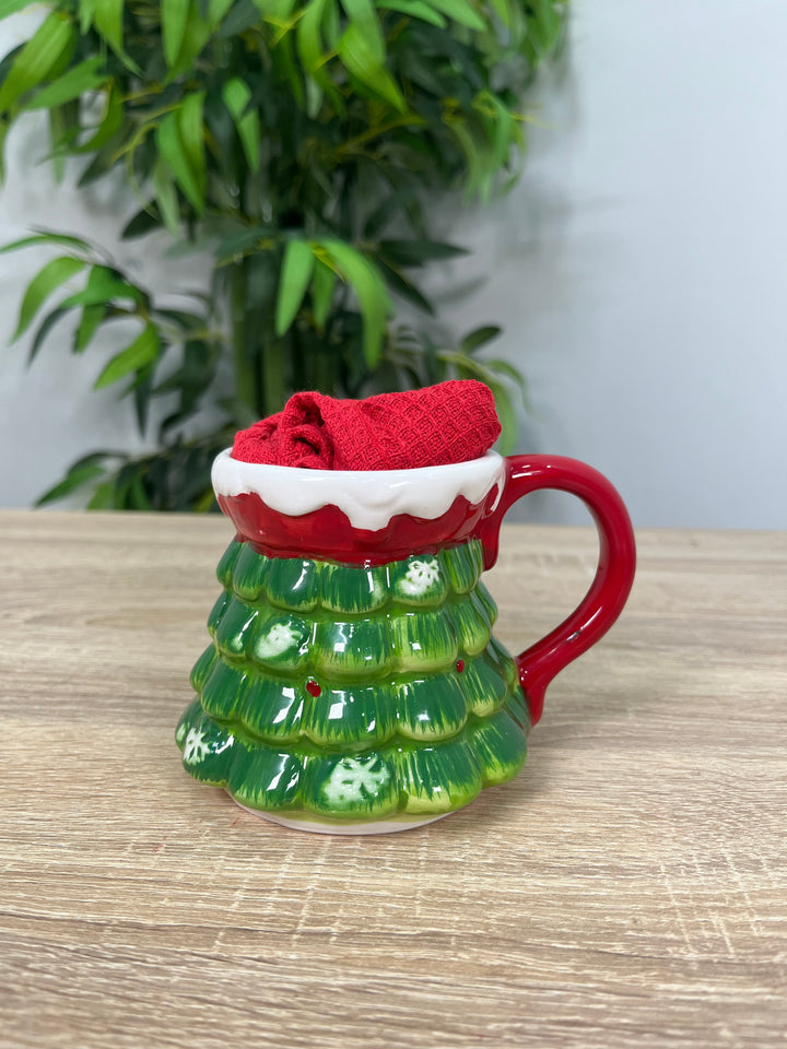 La tazza, realizzata in ceramica smaltata, presenta un design originale a rilievo che richiama un albero di Natale decorato con fiocchi di neve e dettagli bianchi, mentre il bordo rosso e bianco richiama la neve e lo spirito delle feste.