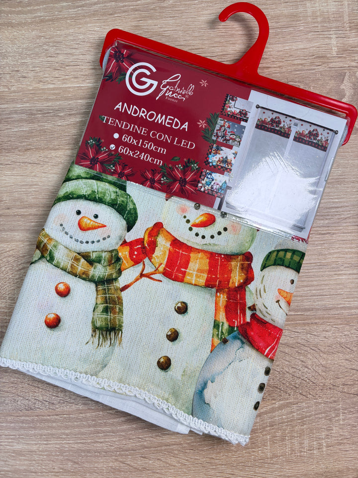 Tendine natalizie con stampa pupazzo di neve e dettagli glitterati, perfette per decorare la casa durante le feste. Realizzate in tessuto resistente, arricchite da luci LED integrate per un effetto luminoso e accogliente.