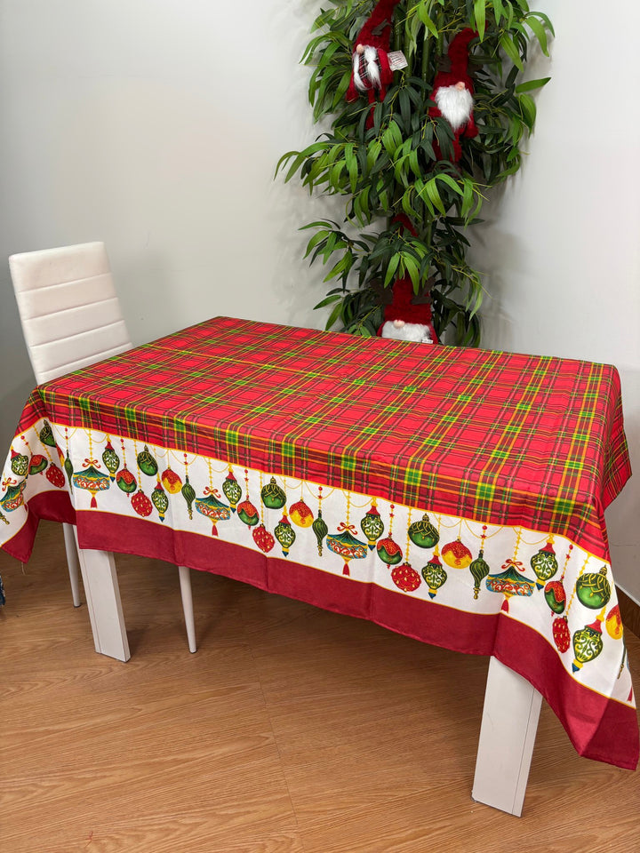 Il tessuto a quadri scozzesi rossi e verdi è impreziosito da un bordo con palline natalizie colorate e dettagli dorati, per un effetto elegante e festoso.