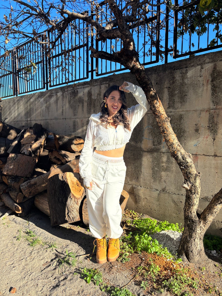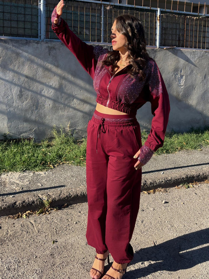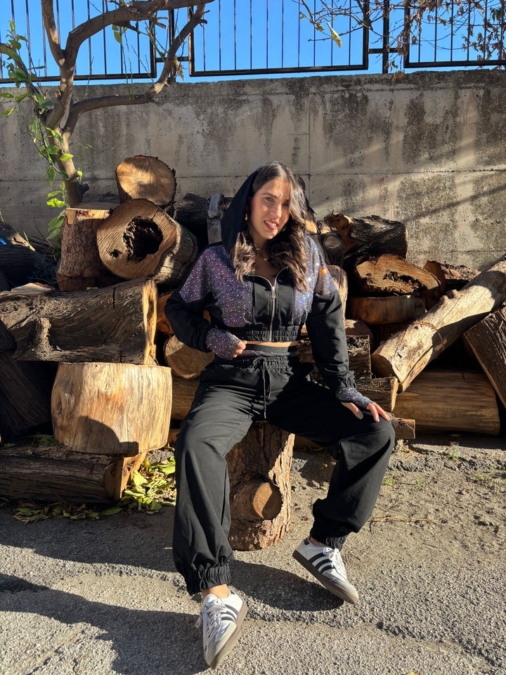 Un completo dallo stile unico che unisce comfort e glamour. La felpa con cappuccio e zip è arricchita da dettagli luminosi che catturano la luce, mentre il pantalone jogger mantiene una linea comoda e versatile. Ideale per chi ama un look casual ma con un tocco chic.